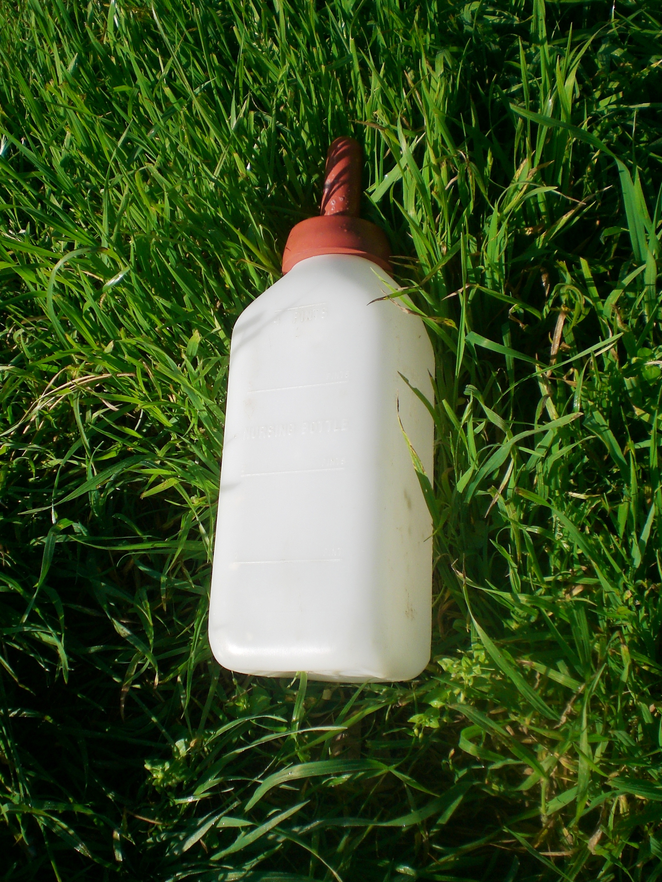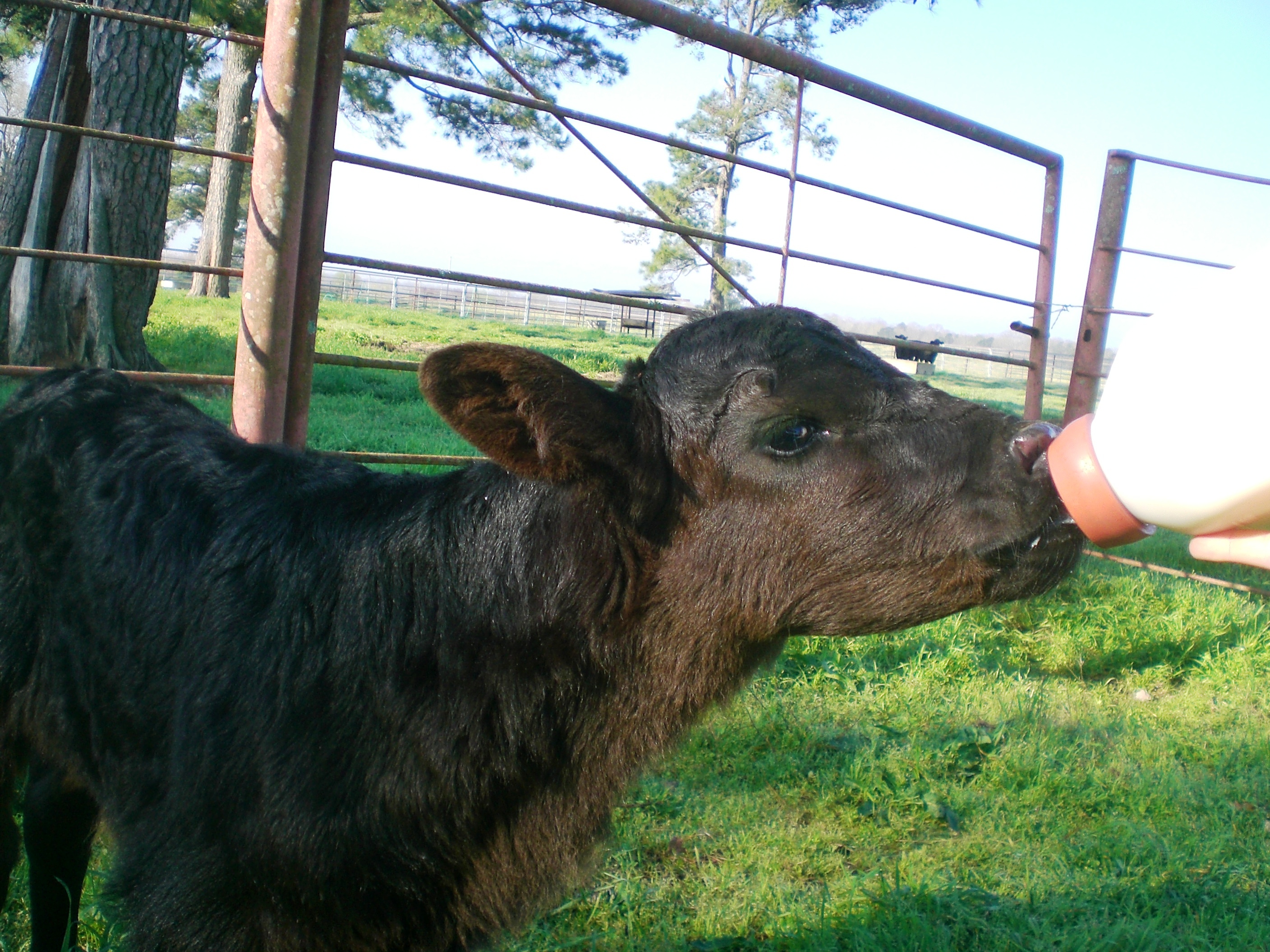 Some might ask What do you feed a baby calf? If the mother cow is still around, she would be milked and the calf fed from a bottle, but then we would not have an orphan calf. It is easiest to have a nurse cow, usually an older dairy cow still giving plenty of milk to raise two, sometimes three, calves at once. When there is no nurse cow around we have milk replacer. Kinda like formula for a child, only in bigger quantities and formulated for a calf’s needs. Ya’ll should check with Jim Fisher (Twitter, Web, Blog), he has a whole ton of info on caring for baby calves.